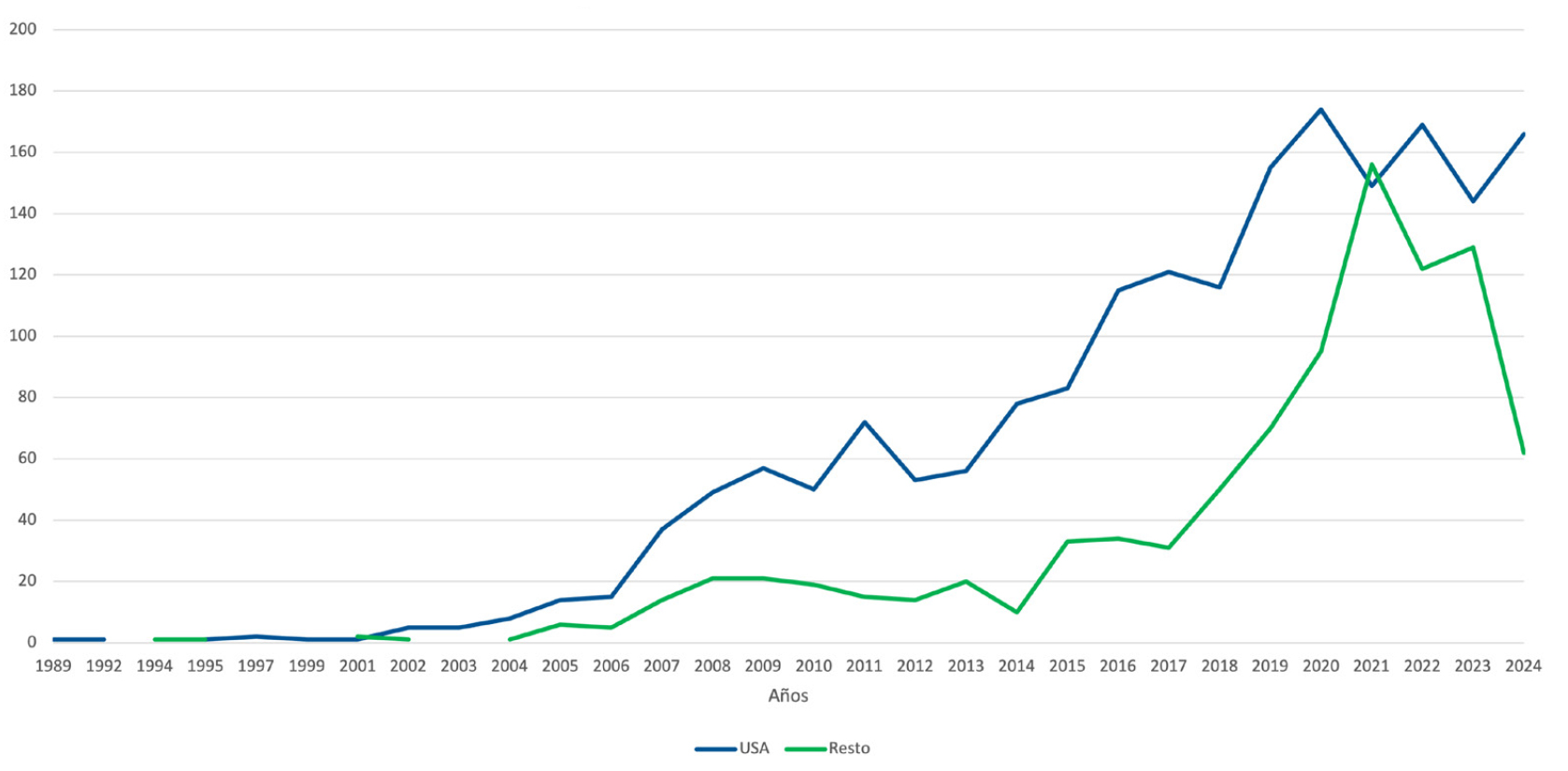Ciertamente, como quedaba patente con la Figura 1, las amenazas y barreras que sufren los defensores medioambientales se mantienen, no pudiendo alegar que se trata de casos aislados o de momentos puntuales en el tiempo o en un territorio, sino que se demuestra que estamos ante un patrón sistemático, reiterado y sostenido en el tiempo que va dirigido a socavar las bases del movimiento de defensa ambiental e impedir el ejercicio de todo derecho humano50. Frente a esta realidad son también llamativas las cifras del Sabin Center for Climate Change Law (Figura 2), que recogen los litigios sobre cambio climático que se han presentado tanto en los Estados Unidos como en el resto del mundo51.